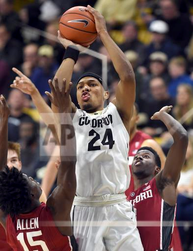 Colorado’s George King shoots over Stanford’s Marcus Allen during the second half of a NCAA college basketball game Thursday, March 2, 2017, in Boulder, Colo. (AP Photo/Cliff Grassmick)