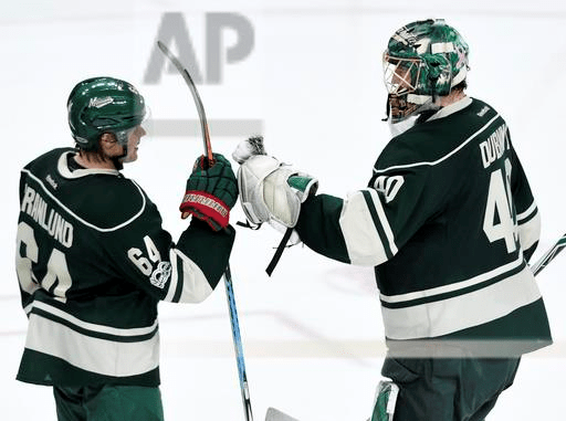 Minnesota Wild center Mikael Granlund (64), of Finland, and goalie Devan Dubnyk (40) celebrate after winning an NHL hockey game against the San Jose Sharks, Sunday, March 5, 2017, in St. Paul, Minn. The Wild won 3-1. (AP Photo/Hannah Foslien)