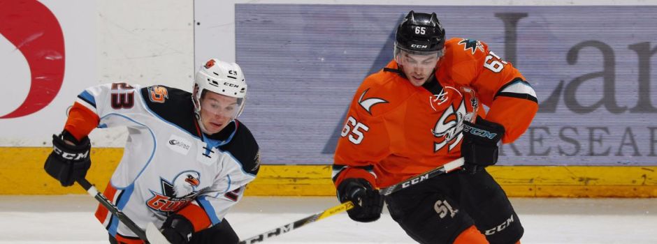 The Barracuda mounted a comeback in the third period with two goals in a span of 2:35. They made it a one-goal game with 2:51 left in regulation when Buddy Robinson found Rourke Chartier, who jammed the puck into the net past Boyle for his 13th of the season. Then, Daniel O’Regan scored on a wrist shot from the point for his 17th of the season, tying the score 3-3 with 15.7 seconds left in regulation.
