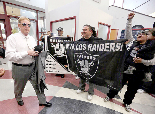 reviewjournal.com photo: Oakland Raiders owner Mark Davis has his game face on as he walks by Las Vegas hopeful fans who have their smiling faces on as Davis builds momentum in moving the Raiders to Vegas