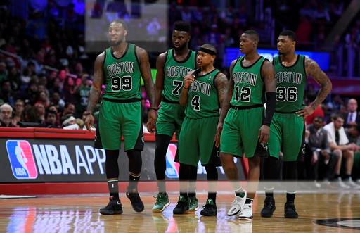 Boston Celtics, from left, Jae Crowder, Jaylen Brown, Isaiah Thomas, Terry Rozier and Marcus Smart walk out to the court after a timeout during the second half of an NBA basketball game against the Los Angeles Clippers, Monday, March 6, 2017, in Los Angeles. The Clippers won 115-102. (AP Photo/Mark J. Terrill)