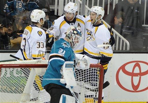 SAN JOSE, CA – MARCH 11: Nashville Predators right wing James Neal celebrates with his teammates after scoring a goal in a NHL hockey game between the Nashville Predators and the San Jose sharks on March 11, 2017 at the SAP Center in San Jose, CA. The Predators beat the Sharks, 3-1. (Photo by Tommy LaPorte/Icon Sportswire) (Icon Sportswire via AP Images) By Barbara Mason SAN JOSE–After beating the top dog Washington Capitols 4-2 off a brilliant performance by Logan Couture, the San Jose Sharks took on the Nashville Predators in an afternoon game at SAP Center. The Predators had a lot to play for since they are currently fighting for a wild card spot. San Jose in turn needs to continue their winning ways to solidify their first place position. As the season heads into the home stretch the race to the playoffs is in full earnest. The Sharks have a seven point lead on the second place Anaheim Ducks which is the largest lead for any first place team in the NHL. With the arsenal of weapons that the Sharks possess it looks very promising for a another run deep into the playoffs. The Predators are struggling of late losing their last four games. While this game is of far more importance to Nashville, San Jose will be onboard for a nice showing in front of their home crowd. Despite a slow start for both teams the play got heated when at 6:18 the Sharks took a 1-0 lead when Paul Martin scored his 4th goal of the season. He was assisted by Joe Thornton. At 12;10 the Predators tied up the game off the stick of Ryan Johansen for his 11th goal of the season. He was assisted by Roman Josi. The first period would come to an end tied. San Jose had taken more shots on goal with 11 to Nashville’s seven. The second period started slowly much as did the first period. There was not much going on until 10:08 when James Neal put Nashville in the lead 2-1 scoring his 19th goal of the season. He was assisted by Colin Wilson. The game would go back into hibernation for the rest of the period. This game was stuck in reverse for the Sharks. Mid-way through the third period the low-energy continued for San Jose. Neither team could muster very much in way of scoring chances although the Sharks had a couple, one of which seemed like a “for sure” goal. It was not the kind of Shark hockey that we have become accustomed to and San Jose would have to work very hard to even tie up this game. San Jose had the perfect chance to tie up the game when goalie Martin Jones left the ice. A missed San Jose pass resulted in a Nashville empty net goal by Viktor Arvidsson. Going on the power play with 2:30 left in the game Arvidsson and the Predators would break their four game losing streak winning 3-1. San Jose will take on the Dallas Stars tomorrow night at SAP. The puck drops at 7:00 PDT.