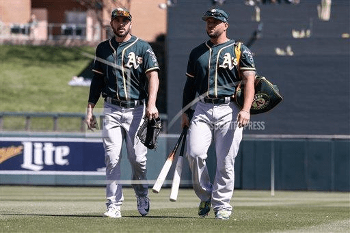 SCOTTSDALE, AZ – MARCH 07: Oakland Athletics first baseman Yonder Alonso (17) and Oakland Athletics right fielder Matt Joyce (23) make their way to the dugout before the spring training baseball game between the Oakland Athletics and the Arizona Diamondbacks on March 7, 2017 at Salt River Fields in Scottsdale, Arizona.(Photo by Kevin Abele/Icon Sportswire) (Icon Sportswire via AP Images)