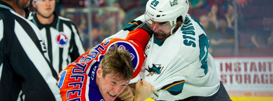 sjbarracuda.com photo: San Jose Barracuda forward Zach Stortini (29) and Bakersfield Condor left winger Braden Christoffer (23) dropped the gloves and fought at 11:47 As a result, both players were assessed five-minute majors for fighting.