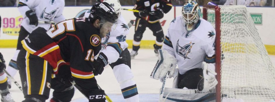 sjbarracuda.com file photo: The Stockton Heat’s center Linden Vey (15) tries to out hustle the San Jose Barracuda’s denfenceman Dan Kelly (46) as San Joe goaltender Troy Groesnick (1) looks on in previous game between San Jose and Stockton. Ana takes a look at the San Jose Barracuda who are coming off successful win against San Diego and Bakersfield and host the Stockton Heat on Friday night at SAP Center