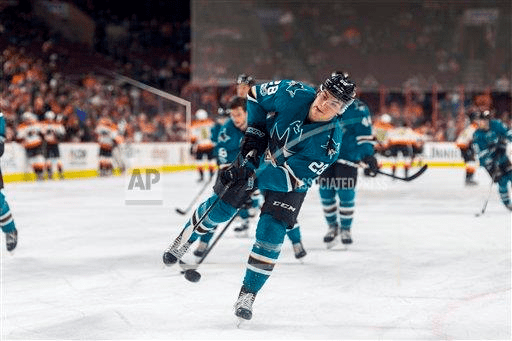 AP file photo: FEBRUARY 11: San Jose Sharks right wing Timo Meier (28) warms up before the NHL hockey game between the San Jose Sharks and the Philadelphia Flyers on February 11, 2017 at the Wells Fargo Center in Philadelphia PA. (Photo by Gavin Baker/Icon Sportswire) (Icon Sportswire via AP Images)