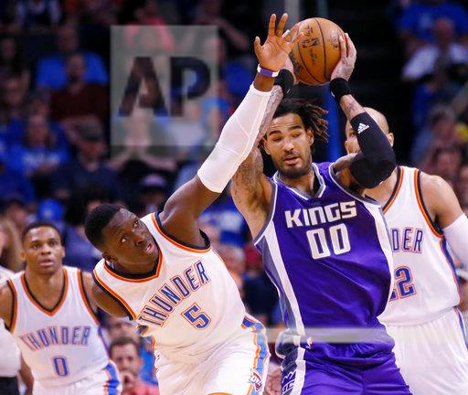 Oklahoma City Thunder guard Victor Oladipo (5) reaches for the ball held by Sacramento Kings center Willie Cauley-Stein (00) in the first quarter of an NBA basketball game in Oklahoma City, Saturday, March 18, 2017. (AP Photo/Sue Ogrocki)