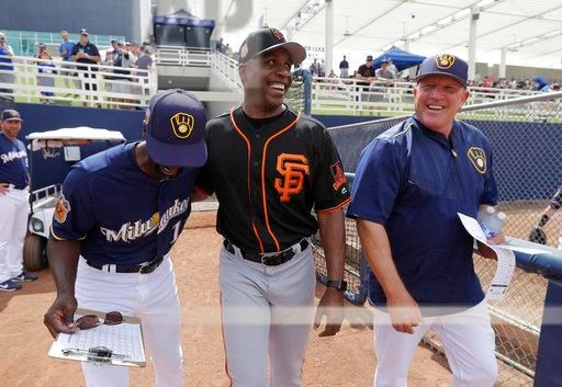 San Francisco Giants’ Barry Bonds walks to the field with Milwaukee Brewers’ Darnell Coles, left, and Pat Murphy for a spring training baseball game Wednesday, March 22, 2017, in Phoenix. (AP Photo/Darron Cummings)