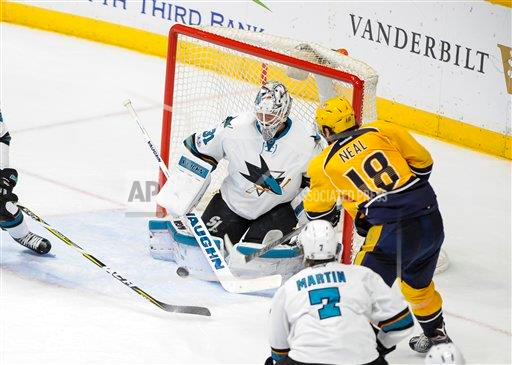 March 25, 2017 Nashville Predators right wing James Neal (18) scores on a shot on goal during 3rd period of a NHL match between the San Jose Sharks and Nashville Predators at Bridgestone Arena in Nashville Tennessee.Steve Roberts /Cal Sport Media (Cal Sport Media via AP Images)