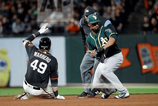 San Francisco Giants’ Chris Marrero, left, slides safely into second base with a double as Oakland Athletics shortstop Marcus Semien waits for the throw from the outfield during the fifth inning of an exhibition baseball game Thursday, March 30, 2017, in San Francisco. (AP Photo/Marcio Jose Sanchez)