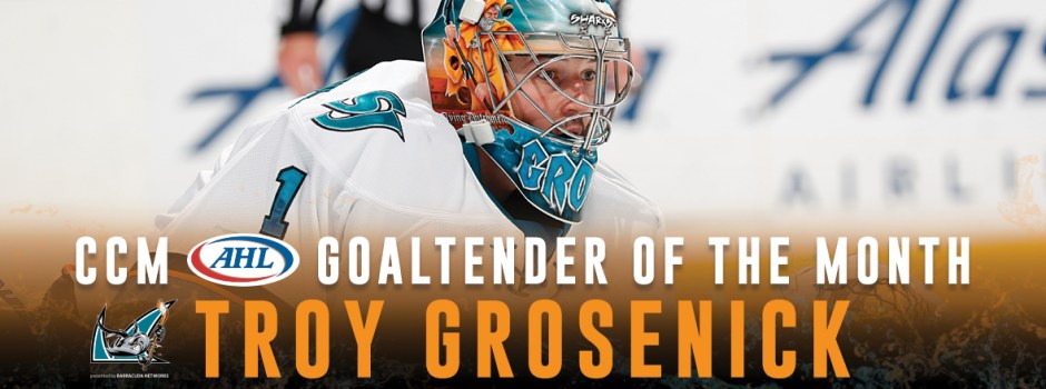 sjbarracuda.com photo: San Jose Barracuda goaltender Troy Grosenick named CCM/AHL Goaltender of the month