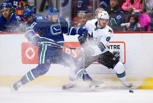 Vancouver Canucks’ Alexander Edler, left, of Sweden, and San Jose Sharks’ Mikkel Boedker, of Denmark, compete for the puck during the third period of an NHL hockey game Sunday, April 2, 2017, in Vancouver, British Columbia. (Darryl Dyck/The Canadian Press via AP