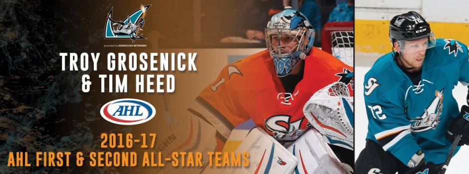 sjbarracuda.com photo: San Jose Barracuda goaltender Troy Grosenick and defenseman Tim Heed are awarded the AHL first and second All Star teams for 2016-17