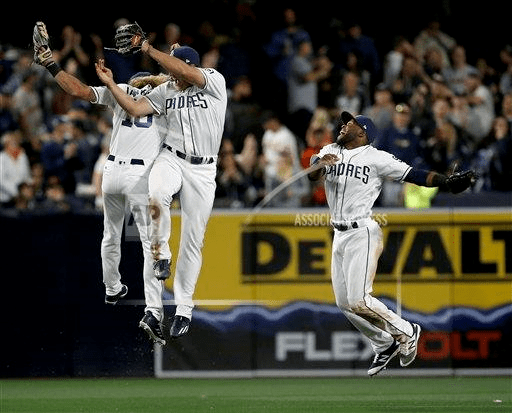 San Diego Padres left fielder Travis Jankowski, left, right fielder Hunter Renfroe, center, and center fielder Manuel Margot, right, celebrate after the Padres won 2-1 against the San Francisco Giants in a baseball game in San Diego, Saturday, April 8, 2017. (AP Photo/Alex Gallardo