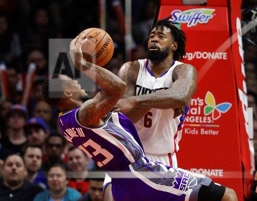 Sacramento Kings’ Ben McLemore, left, is fouled by Los Angeles Clippers’ DeAndre Jordan during the second half of an NBA basketball game Wednesday, April 12, 2017, in Los Angeles. The Clippers won 115-95. (AP Photo/Jae C. Hong)