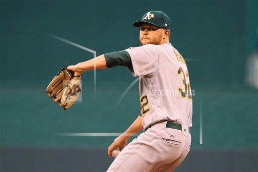 AP photo file: Oakland Athletics starting pitcher Jesse Hahn (32) will start against the Los Angeles Angels on Tuesday night Apr 25th warms up before the first inning of an MLB game between the Oakland Athletics and Kansas City Royals on April 13, 2017 at Kauffman Stadium in Kansas City, MO. The Royals won 3-1. (Photo by Scott Winters/Icon Sportswire) (Icon Sportswire via AP Images)