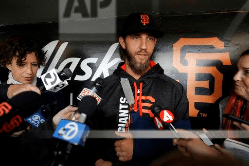 San Francisco Giants pitcher Madison Bumgarner answers questions about his shoulder injury before a baseball game against the Los Angeles Dodgers, Monday, April 24, 2017, in San Francisco . (AP Photo/Marcio Jose Sanchez)