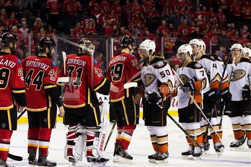 AP file photo: CALGARY, AB – APRIL 19: The Anaheim Ducks move on to the second round of the NHL Stanley Cup playoffs, sweeping the Calgary Flames in 4. As is customary in the NHL, the teams have a handshake at the end of each series during game 4 of the first round of the Stanley Cup Playoffs between the Anaheim Ducks and the Calgary Flames on April 19, 2017 at Scotiabank Saddledome in Calgary, AB. (Photo by Clint Trahan/Icon Sportswire) (Icon Sportswire via AP Images