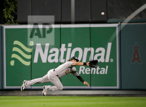 Oakland Athletics center fielder Jaff Decker dives in an unsuccessful attempt to catch a double hit by Los Angeles Angels’ Martin Maldonado during the second inning of a baseball game, Wednesday, April 26, 2017, in Anaheim, Calif. (AP Photo/Jae C. Hong)