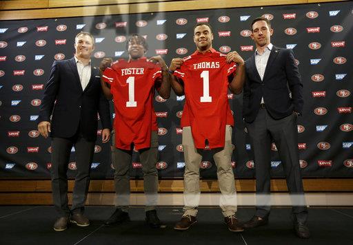 From left to right, San Francisco 49ers general manager John Lynch poses for photos with draft picks Reuben Foster, Solomon Thomas and head coach Kyle Shanahan at a news conference in Santa Clara, Calif., Friday, April 28, 2017. (AP Photo/Jeff Chiu)
