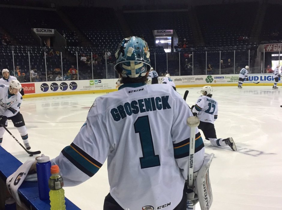 The Barracuda’s defense remained solid in the second period. Both teams exchanged chances and Andrew Mangiapane almost scored the game-tying goal, but Grosenick made an incredible left pad save to hold onto a 1-0 lead. However, Stockton made it a game after Hunter Shinkaruk picked up a loose puck on Matt Frattin’s turnover for the equalizer and his second goal of the playoffs.