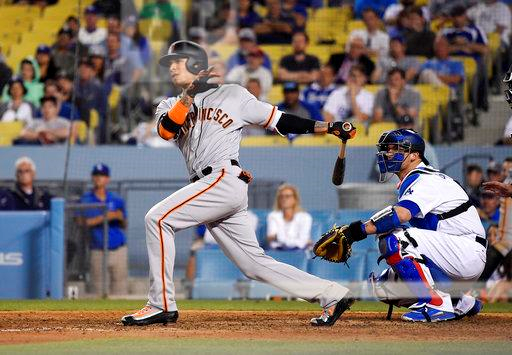 San Francisco Giants’ Gorkys Hernandez, left, hits an RBI double as Los Angeles Dodgers catcher Yasmani Grandal watches during the 11th inning of a baseball game, Wednesday, May 3, 2017, in Los Angeles. (AP Photo/Mark J. Terrill)