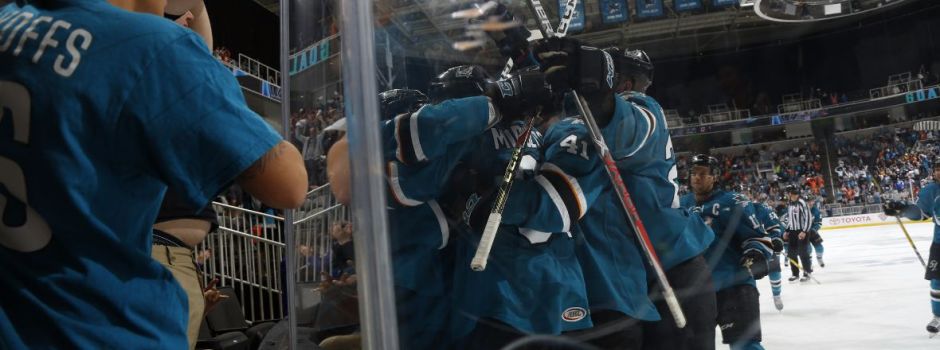 sjbarracuda.com photo: San Jose Barracuda celebrate their division advance last Tuesday night as they head to the next round of the playoffs against San Diego in the best of four out of seven games starting Friday night at SAP Center