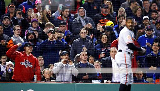 Boston Red Sox fans taunt and take pictures of Baltimore Orioles’ Adam Jones after he was ejected for arguing a strikeout call during the fifth inning of a baseball game at Fenway Park in Boston, Wednesday, May 3, 2017. (AP Photo/Charles Krupa)