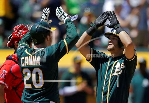 Oakland Athletics’ Chad Pinder, right, celebrates with Mark Canha after hitting a 2-run home run off Los Angeles Angels’ Jesse Chavez in the fifth inning of a baseball game Wednesday, May 10, 2017, in Oakland, Calif. (AP Photo/Ben Margot)