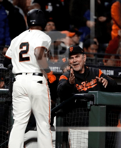 San Francisco Giants manager Bruce Bochy, right, greets Denard Span (2) in the dugout after Span’s solo home run against the Cincinnati Reds during the fifth inning of a baseball game Thursday, May 11, 2017, in San Francisco. (AP Photo/Marcio Jose Sanchez)