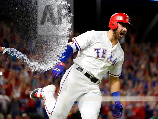 Texas Rangers’ Keone Kela, out of photo at left, sprays a bottle of water over Joey Gallo as he rounds first following his three-run walk off home run against the Oakland Athletics during a baseball game, Friday, May 12, 2017, in Arlington, Texas. The Rangers won 5-2. (AP Photo/Tony Gutierrez)