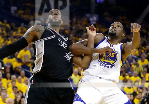 San Antonio Spurs’ LaMarcus Aldridge (12) and Golden State Warriors’ Kevin Durant (35) work for position under the basket during the second half of Game 2 of the NBA basketball Western Conference finals, Tuesday, May 16, 2017, in Oakland, Calif. (AP Photo/Marcio Jose Sanchez)