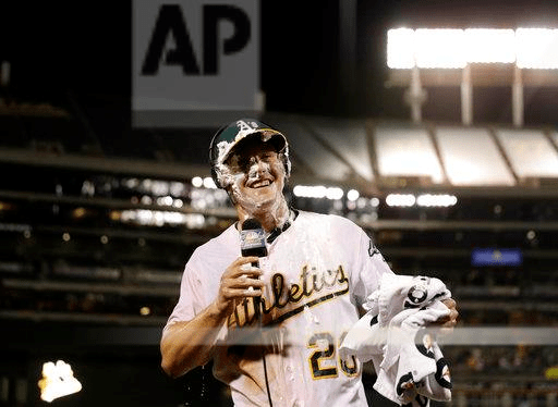 Oakland Athletics’ Mark Canha smiles as he does an interview after being hit in the face with shaving cream following his solo walk-off home run during the 10th inning of a baseball game against the Boston Red Sox on Friday, May 19, 2017, in Oakland, Calif. Oakland won 3-2. (AP Photo/Marcio Jose Sanchez)