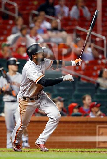 San Francisco Giants’ Eduardo Nunez watches his two-run double during the ninth inning of a baseball game against the St. Louis Cardinals on Friday, May 19, 2017, in St. Louis. (AP Photo/Jeff Roberson)