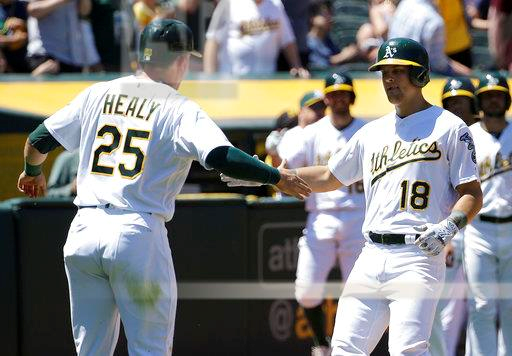 Oakland Athletics’ Chad Pinder (18) is congratulated after hitting a two-run home run that scored Ryon Healy (25) against the Boston Red Sox during the fourth inning of a baseball game in Oakland, Calif., Sunday, May 21, 2017. (AP Photo/Jeff Chiu)