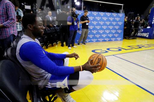 Golden State Warriors’ Draymond Green watches from a fan seat during an NBA basketball practice, Wednesday, May 31, 2017, in Oakland, Calif. The Golden State Warriors face the Cleveland Cavaliers in Game 1 of the NBA Finals on Thursday in Oakland. (AP Photo/Marcio Jose Sanchez)