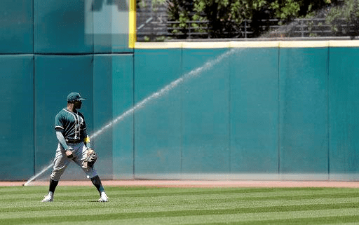 The Indians scored four runs in the sixth and three in the seventh to win the game for their ace Corey Kluber. Here’s how things fell apart for Oakland. Erik Gonzalez led off with a single, Cotton then walked Jason Kipnis to put men on at first and second with no out. Francisco Lindor laid down a bunt that A’s third baseman Ryon Healy bobbled for an error and that loaded the bases. Cotton walked Michael Brantley to make it 2-0. The Indians were the recipients of two walks and error for that run. The A’s weren’t done committing fielding blunders. Carlos Santana hit a popup that shortstop Adam Rosales couldn’t find in the sun. The ball landed between Rosales and Mark Canha. Canha hesitated to come in for the ball, and it dropped safely, and that allowed another run to score. With the bases still loaded and no out, Jose Martinez hit a comebacker to Cotton. Cotton fielded it cleanly but almost threw the ball away. Phegley made a nice play to record the out at home. With the infield drawn in, Cotton got the batter to hit the ball on the ground. The out was recorded at home, but the runner was called out at first to complete the double play. A’s first baseman, Yonder Alonso, thought that was the third out of the inning and headed to the dugout. Santana kept on running and tried to score all the way from second on the play. The home plate umpire called him out. However, and this was a first for this writer, the plays at first and home were challenged, and both calls were reversed. John Axford relieved Cotton. The Indians tallied the fourth run when Healy made another error. The Indians had scored four runs thanks to the ineptness of the A’s defense and now trail 5-0 after six. There was then a game delay as the sprinklers went off in left field, and play had to be stopped until someone could turn them off.