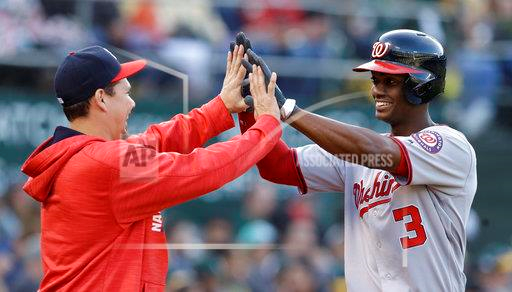 Washington Nationals’ Michael Taylor, right, celebrates with Jose Lobaton after hitting a home run off Oakland Athletics’ Andrew Triggs in the second inning of a baseball game Friday, June 2, 2017, in Oakland, Calif. (AP Photo/Ben Margot)