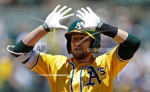 Oakland Athletics’ Jed Lowrie celebrates after hitting a two run home run off Washington Nationals’ Joe Ross in the first inning of a baseball game Saturday, June 3, 2017, in Oakland, Calif. (AP Photo/Ben Margot)