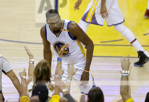 Golden State Warriors forward Kevin Durant (35) in Game 1 of the NBA Finals in Oakland, Calif., Thursday, June 1, 2017. (AP Photo/Marcio Jose Sanchez)
