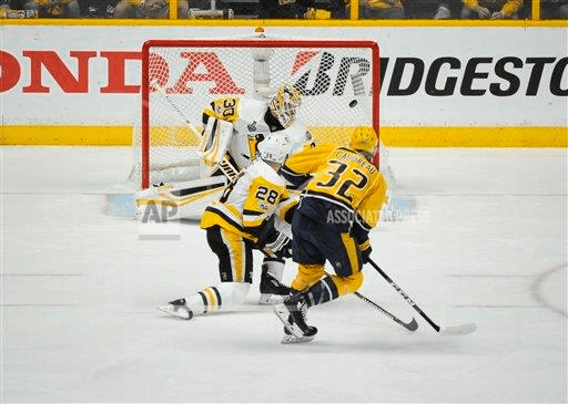 Nashville TN, USA Nashville Predators center Frederick Gaudreau (32) scores the second goal during the second period of game three between the Pittsburg Penguins vs the Nashville Predators in the Stanley Cup Finals at Bridgestone Arena. Steve Roberts /Cal Sport Media (Credit Image: © Steve Roberts/Cal Sport Media/CSM via ZUMA Wire) (Cal Sport Media via AP Images)