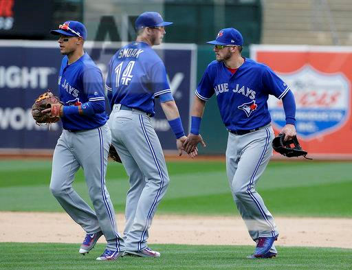 Toronto Blue Jays shortstop Ryan Goins, from left, celebrates with first baseman Justin Smoak (14) and Josh Donaldson after a baseball game against the Oakland Athletics in Oakland, Calif., Wednesday, June 7, 2017. The Blue Jays won 7-5 in ten innings. (AP Photo/Jeff Chiu)