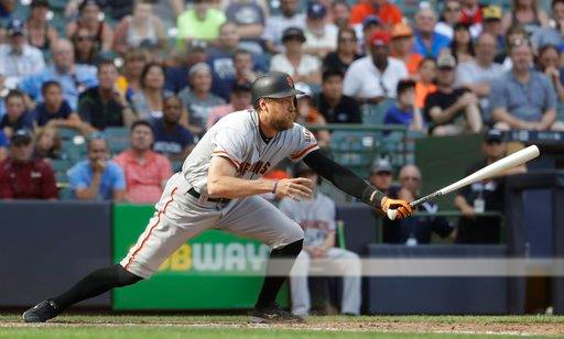 San Francisco Giants’ Hunter Pence hits an RBI single during the 10th inning of a baseball game against the Milwaukee Brewers Thursday, June 8, 2017, in Milwaukee. (AP Photo/Morry Gash)