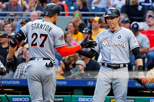 Miami Marlins’ Giancarlo Stanton (27) is greeted by Christian Yelich after hitting a solo home run off Pittsburgh Pirates starting pitcher Tyler Glasnow during the third inning of a baseball game in Pittsburgh, Friday, June 9, 2017. (AP Photo/Gene J. Puskar)
