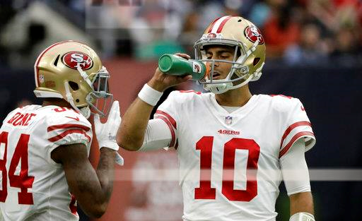 San Francisco 49ers quarterback Jimmy Garoppolo (10) stands on the sideline during an NFL football game against the Houston Texans, Sunday, Dec. 10, 2017, in Houston. (AP Photo/David J. Phillip)