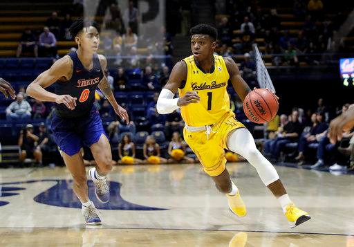 California guard Darius McNeill (1) dribbles past Cal State Fullerton guard Kyle Allman (0) during the first half of an NCAA college basketball game Saturday, Dec. 16, 2017, in Berkeley, Calif. (AP Photo/Marcio Jose Sanchez)