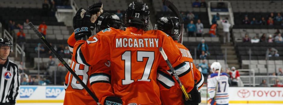 sjbarracuda.com photo: John McCarthy (17) celebrates with teammates as the Barracuda prepare for back to back games in Bakersfield on Thursday and in San Jose against Texas on Friday night