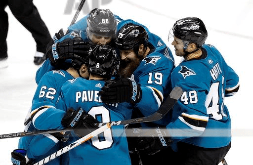 San Jose Sharks’ Joe Pavelski, bottom center, is hugged by teammates after scoring during the third period of an NHL hockey game against the Los Angeles Kings on Saturday, Dec. 23, 2017, in San Jose, Calif. (AP Photo/Marcio Jose Sanchez)