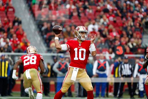San Francisco 49ers quarterback Jimmy Garoppolo (10) passes against the Jacksonville Jaguars during the first half of an NFL football game in Santa Clara, Calif., Sunday, Dec. 24, 2017. (AP Photo/Tony Avelar)