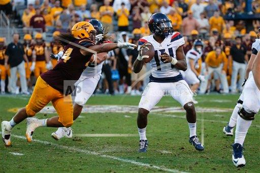 AP File Photo: Arizona Wildcats quarterback Khalil Tate (14) looks to pass just out of reach of Arizona State Sun Devils linebacker Alani Latu (44) during the college football game between the Arizona Wildcats and the Arizona State Sun Devils on November 25, 2017 at Sun Devil Stadium in Tempe, Arizona. (Photo by Kevin Abele/Icon Sportswire) (Icon Sportswire via AP Images)